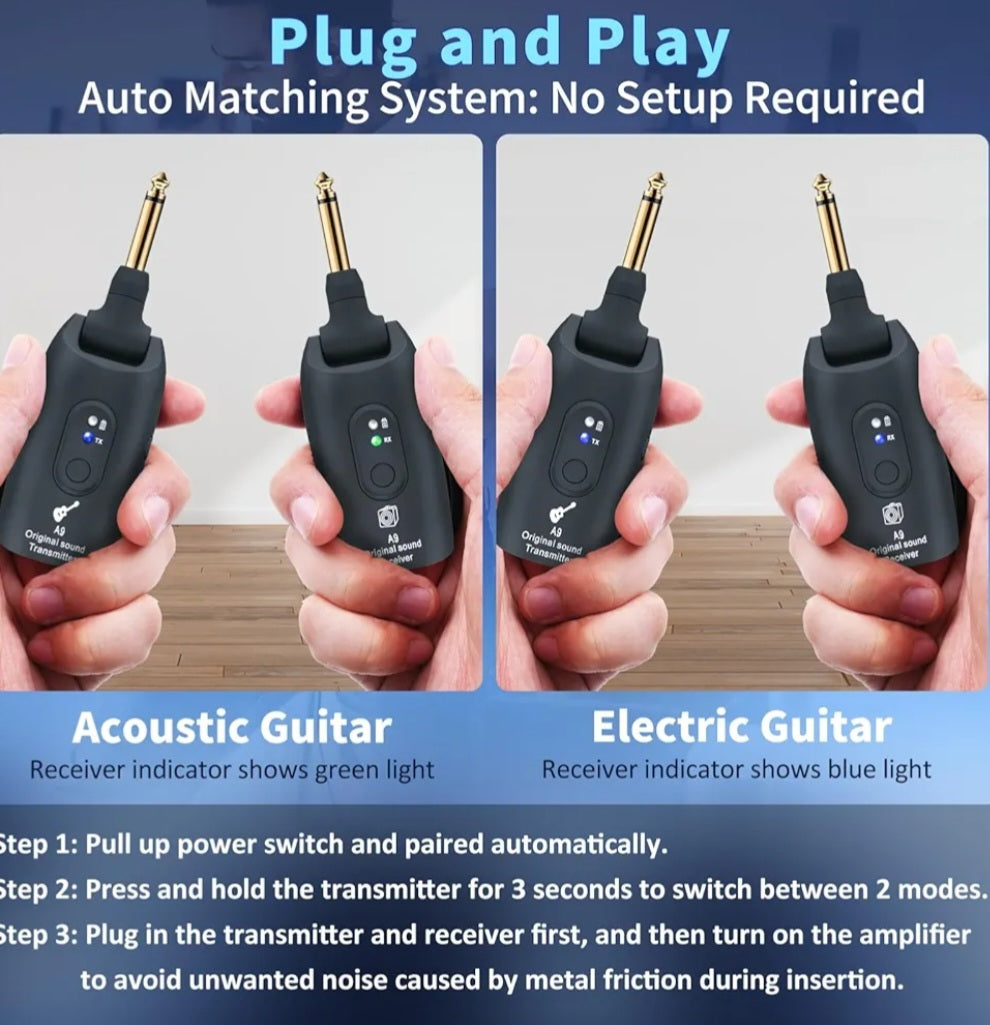 Rechargeable 2.4GHz wireless guitar system with 100ft range, 270Β° jack & 4h playtime. Includes free 6-pick set + tin ($10 value). Plug in & play cable-free!