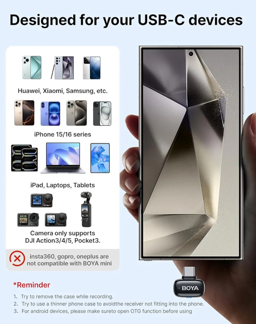 5g Ultralight & Discreet Design: BOYA’s wireless microphone transmitter weighs only 5g, designed for all-day comfort. Perfect for vlogging, interviews, or live streaming without distracting your audience.