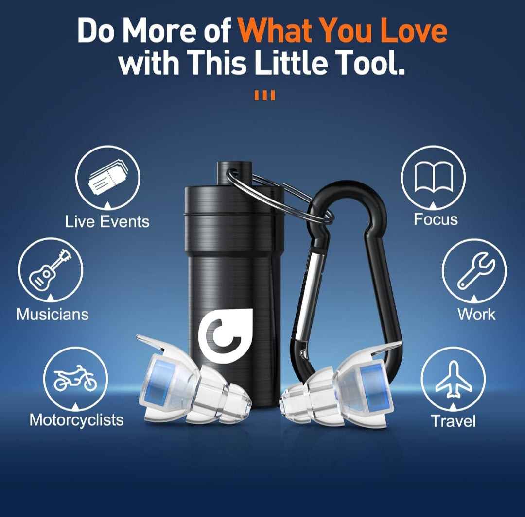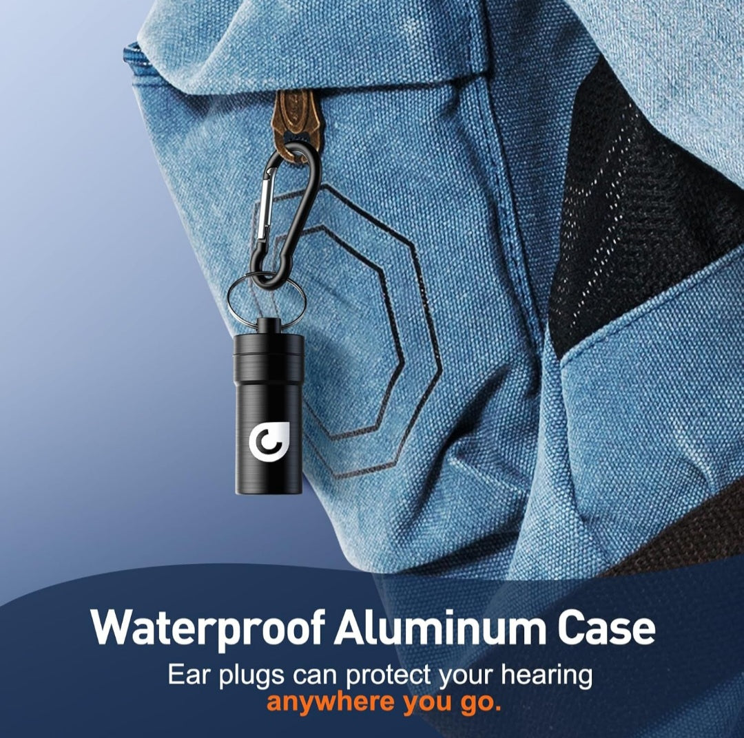 REURE CAN PROTECT YOU ANYWHERE - The compact aluminum case with rubber seal is waterproof and dustproof. You can carabiner it on your key chain, jeans, or backpack and it can follow you anywhere. Ideal for concerts, noise sensitivity, tinnitus relief, motorcycles, musicians, sports events, flying, sleeping noise cancelling, etc.